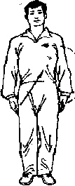 身体直立挺胸、立腰收腹敛臀两腿挺膝并拢两脚尖外展成立正姿势两臂自然下垂两掌向下掌心停于两腿外