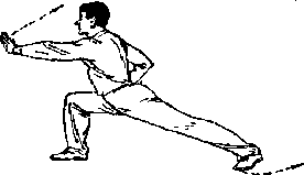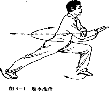 (1)身体稍左转右脚向右侧横出一大步左腿屈膝半蹲成左弓步同时右掌由下经晾前向左斜前方伸出掌心向上,掌指向左侧拇指向前掌高与肩平左掌从上下落扶于右肘内侧眼看右掌(图3—1)口
