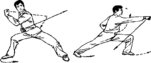 以左脚跟、右脚掌为轴向左转体一百八十度成左弓步同时左掌变拳稍上举、臂外旋屈肘、拳高与额平、随转体左前臂从前向左摆弧力达前臂,摆至左侧方后收抱于左腰际拳心向上右拳在左臂格挡的同时从腰间内旋加速向前击出右臂伸直拳心向下,力达拳面拳与肩平眼向前方平视(图