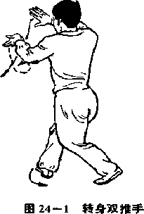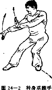 重心前移右脚向前上一步,身体向左后转一百八十度左脚后退一步,右脚收回半步,成右含机步在转体的同时,两掌向左向后经头上向右再向前依次划平圆,从右上左下右前,左后待绕至身前时两掌跟合拢收于右腹前两掌心斜相对左上、右下掌指斜向前两臂向前伸出臂微屈力达掌心眼看两学(图24—124—2)