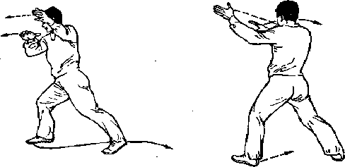 图26-3右丢手图26-3右丢手重心稍向后移左脚收回半步成左含机步同时左拳变掌从右向下经左向上屈肘翻掌掌心向上掌指向左掌高与肩平左肘由左向右、向后格挡力达前臂右拳变掌从下经胸前、向上停于左肘内侧处,掌