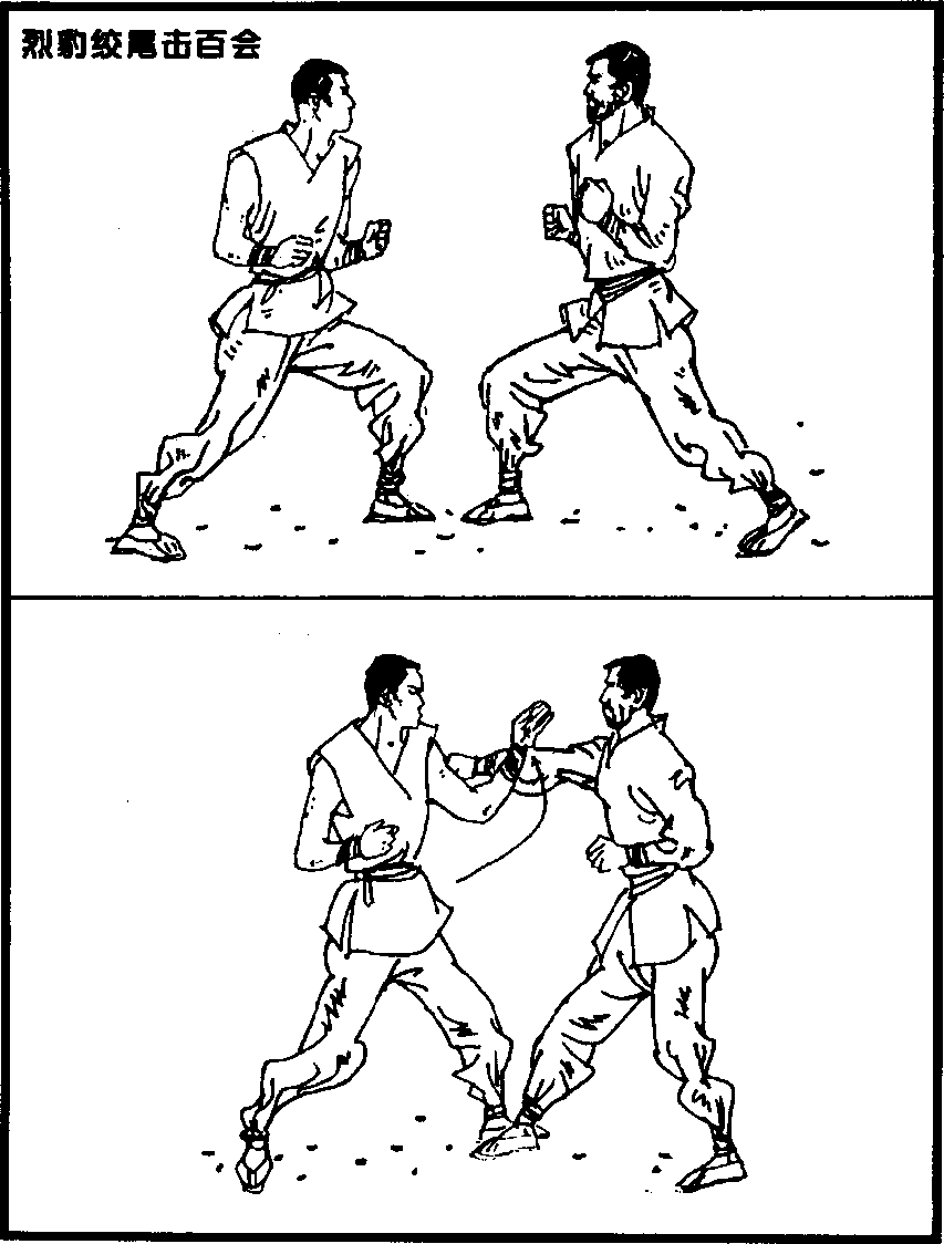 3我方立即含胸缩腹左足成虚步足尖点地已将对方来拳化解。同时我再挥左拳将对方右手向外横扫将击来之拳挡拨一旁此时我已处于主动地位。
