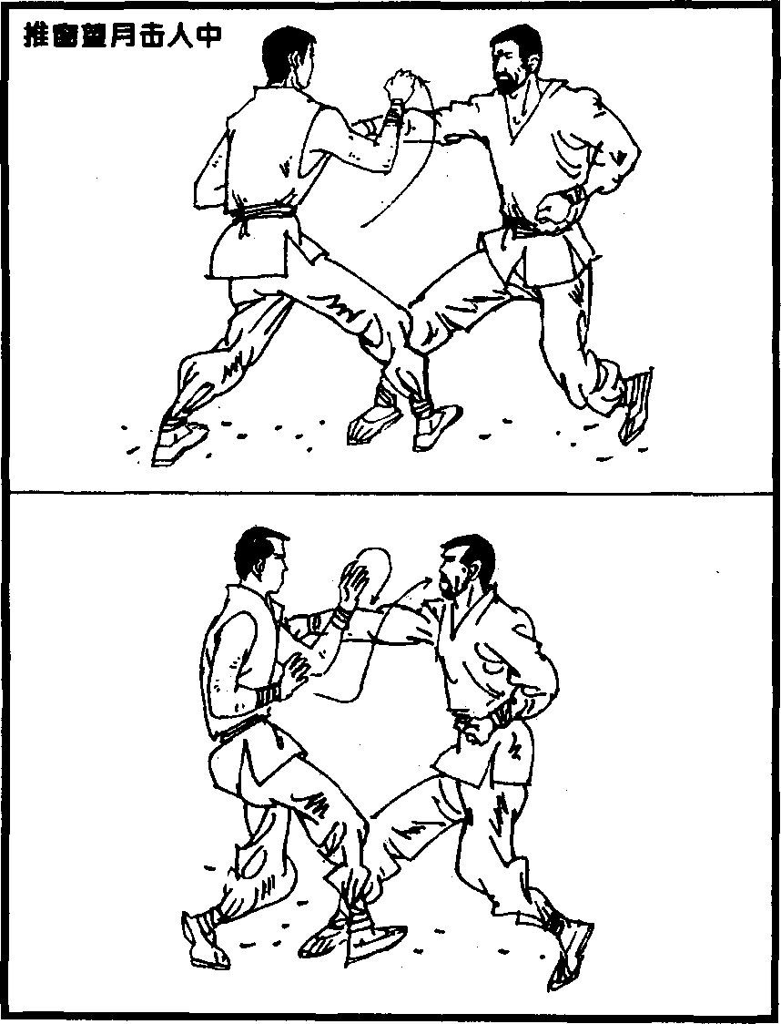 4 左脚前跨逼近对方右拳原处化掌以掌底按压对方下颌部。