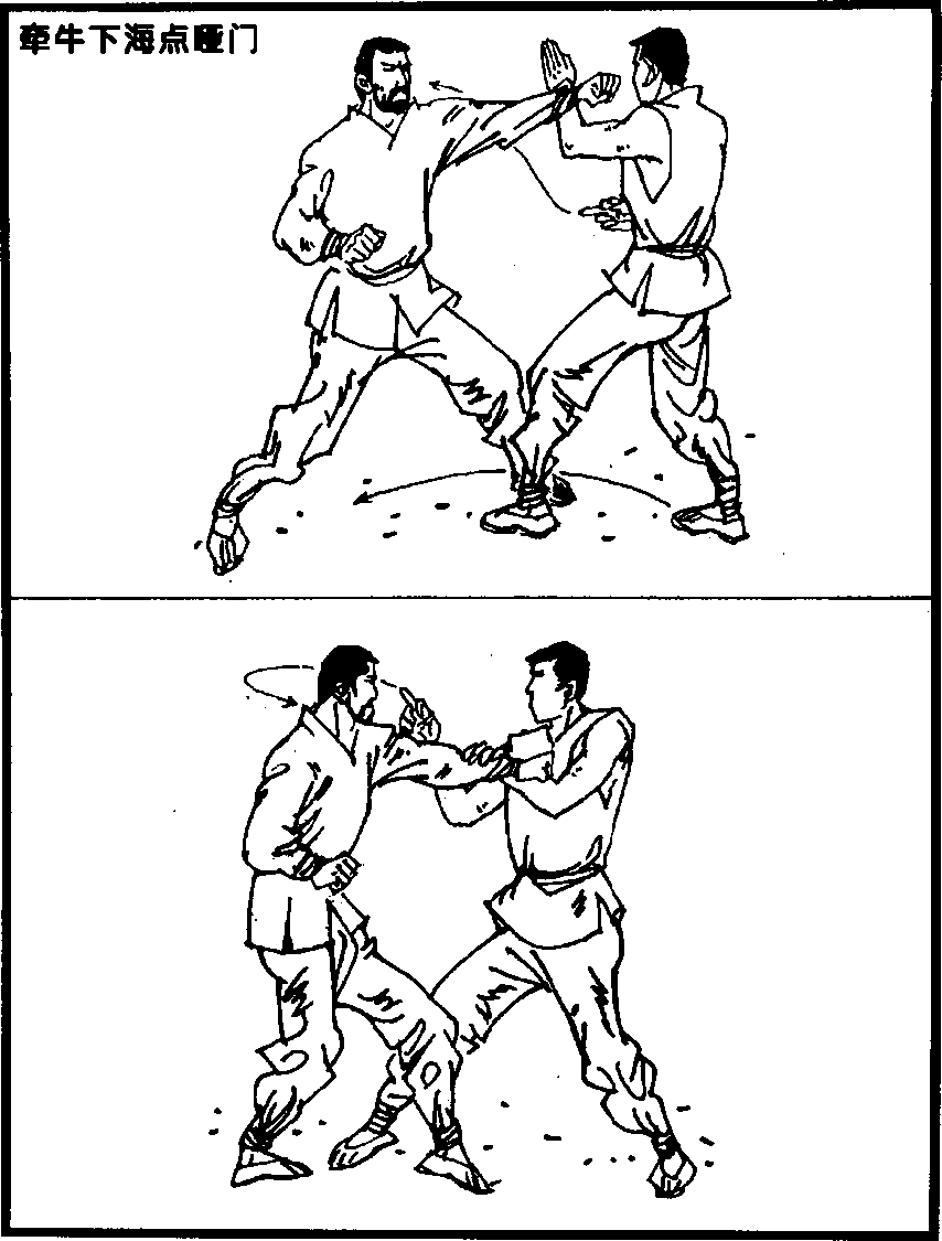 4 将对方向前牵拉,右金针指点击对方哑门穴。