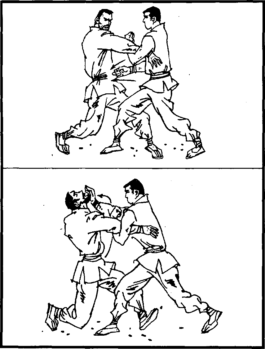 3 我方跨进右步插入对方裆部左臂如挑灯般反扣对方右手我右鹤咀拳直击对方腹部期门穴或丹田穴。