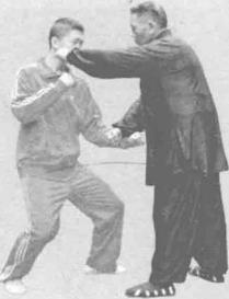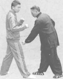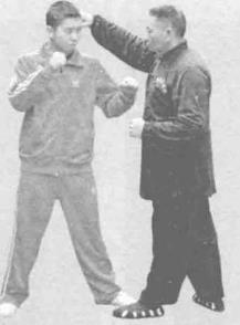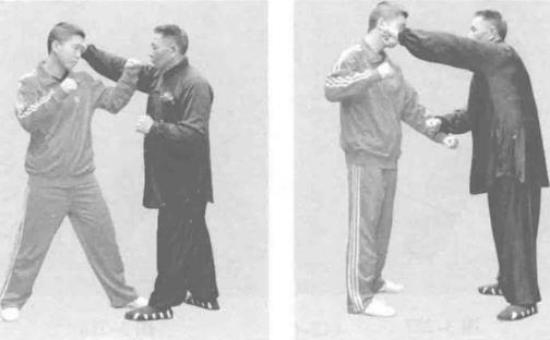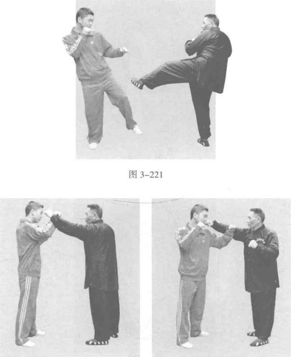 甲乙双方平行步站立甲左脚向前滑步并以左摆拳攻击乙头部右侧乙退右脚下闪避过(图3-219),甲变右摆拳击乙头部左侧。(图3-220)图3-2193掩护中的摆拳甲乙双方平行步站立甲右垫步以左低鞭腿攻击乙右腿乙后跳避过(图3-221),甲左摆拳攻击乙脸右侧乙右前臂格拦(图3-222),甲再以右摆拳攻击乙面部。(图3-223)4惊下取上的摆拳甲乙双方平行步站立甲右脚向前滑步以左拳攻击乙裆部乙后跃步避过(图3-224),甲左脚上步右摆拳攻击乙头部乙左前臂格挡(图3-225),甲再以左摆拳攻击乙后脑。(图3-226)图3-224第四节多变刚柔术