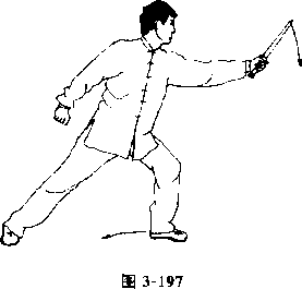 3}左手握剑随体右转向右手方向划弧成立剑划剑力达剑尖直臂剑尖高不低于肩右剑指变拳摆至右胯侧目视左方。(图3-197)