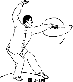 肩平右拳变剑指向右上方划弧至头上方手心朝匕剑指指向左方口目视左方口(图3-198)