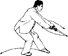 〔1)身体重心移至右脚上体微向左方倾展胸、塌腰口