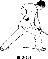 (3)左手握剑收至左腰间然后向右腿的右前下方成立剑扎出直臂剑尖高不过膝鼻右剑指变拳收至右腰间虎3朝左目视扎剑方向(图201)
