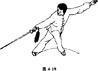 6右手握剑向身后下方刺剑的关节伸直使剑与手臂在一条直线上左臂伸直手心朝前方剑指指向右臂的反向。目视右下方(图小19)