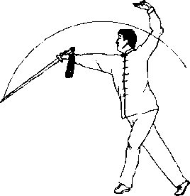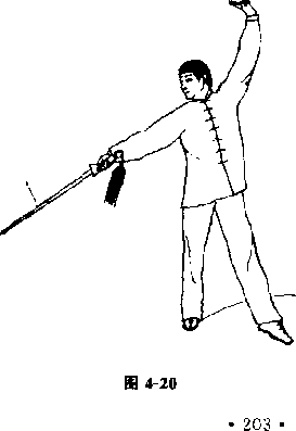 (3)右手提剑姿势不变『左臂向左上方伸直剑指朝右上方手心朝左上方,目视右下方,(图4-20)