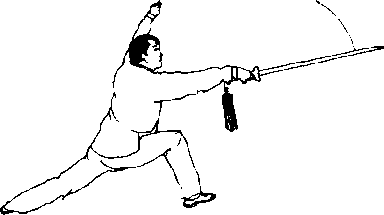 (6)右手握剑经上方向钵左下方划弧手臂微屈剑与臂约成90口剑身与地面平行在右手向左方下落时,左剑指扶在右手腕上,肘关节弯曲一起划弧