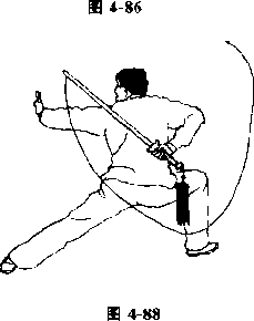 )右手握剑上举使剑横向高过头随身体右转边转边于头上云剑在右脚落步的同时右小臂内旋后翻屈肘手心朝外将剑背于背后。左手扶在右手腕上一起云剑在右臂屈肘时左剑指由右肩前向外划弧使手臂伸直剑指朝上口目视左手方向(图4-86?图4-88)
