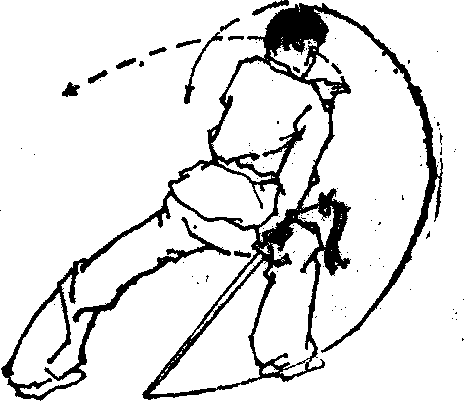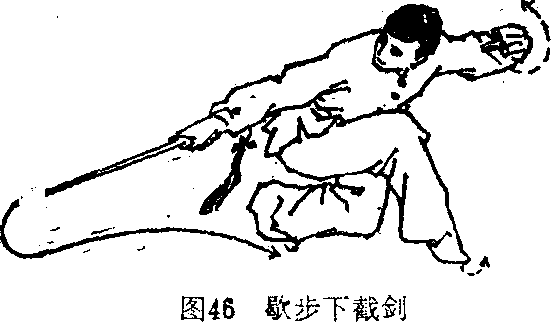 身体转向右后方,右脚尖外展向前盖步,左脚后跟提 起,以前脚掌着地,.两腿屈膝全蹲成歇步;同时右手持剑内 旋,剑随转体由上向后下截击,力达剑刃前端,剑尖下斜,