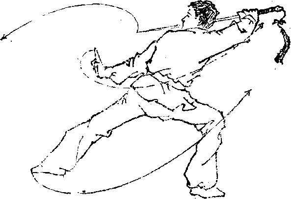 若敌方以械刺我头部,我即反手向上领开其械,同时顺 势翻腕,剑由上向下,截击其下部.