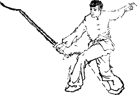 若敌方以械击我头部,我即右手持剑外翻向上领开其? 械,同时上步下蹲向前探身,使剑由上向前下削截敌腿部。