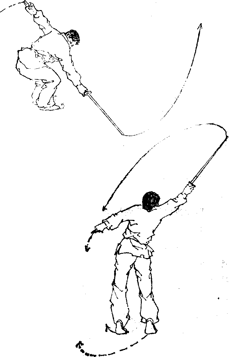 腿挺膝伸直,两脚后跟提起,胯猛向上挺,身体向前上探; 同时右手持剑外旋,尽力前伸,剑由下向前上撩击,两剑刃 朝上、下方’剑尖上斜,力达剑刃前端;左手剑诀随撩剑向 左后下摆至胯侧;目视剑尖(图58—3).