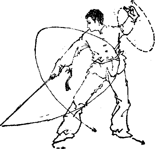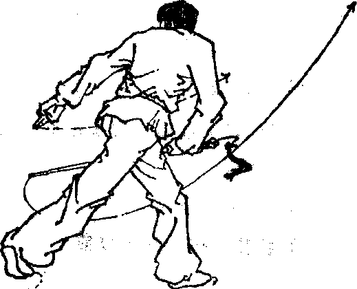 械方以械刺我曲部,我即向左摆步,侧身闪过其械, 即刻转身以剑刃前端,反撩散腕或颈部。