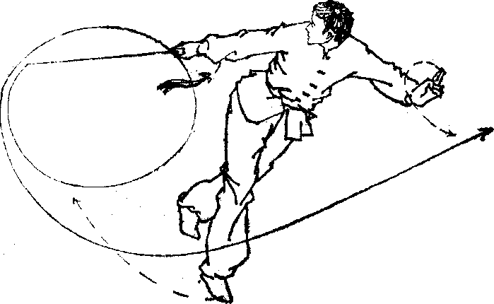 若敌方以械刺我下部, 我即撤步躲开,以剑向下反 撩其腕项并顺势摆步翻腕, 以剑上截其颈部。