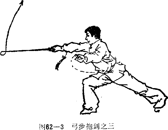 右方j左手剑诀随转体向前屈肘置于胸前;目视§9尖(图 62—3 ) o