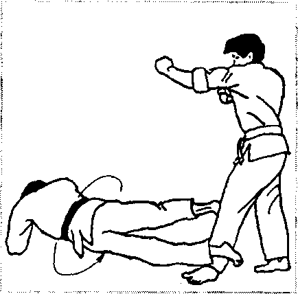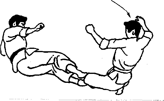 当其欲俯身下击时,突然起脚向前、向左猛踢他裆部,令其 侧前倒地(图2- 765)。