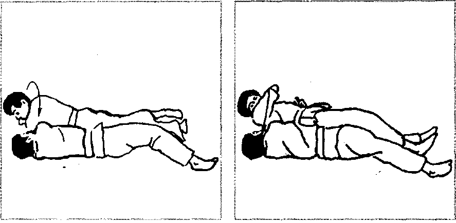 不慎倒地后,可两脚上下夹住对方靠我最近的那只脚(图 2 - 762),身体猛地向右翻滚一周,左脚向前,右脚向后将对方 绞翻倒地(图2~763)。