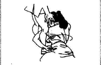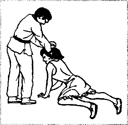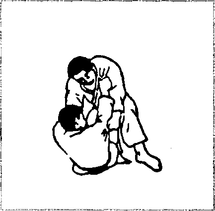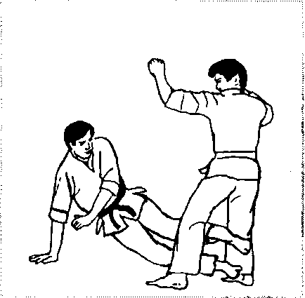 被歹徒抓发前拖倒地(图2- 777),可借其抓发下按之势, 双手紧抱其脚腕(图2-778),肩部向前猛撞其膝关节,即可令 歹徒向后倒地(图2-779)。