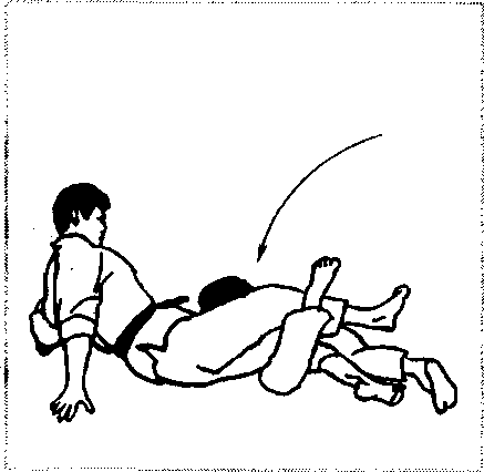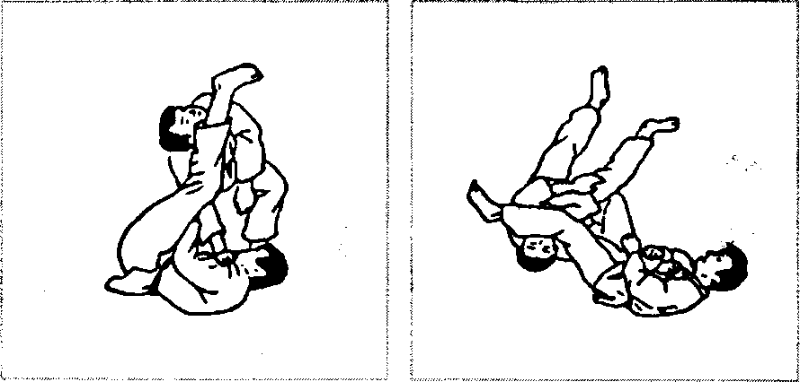 不慎倒地后,对方俯身卡喉(图2-772),我可左手反抓其 手,右手撑胸,上身在地上平磨,屈起左腿夹住其头猛向后僵 压,可令其向后翻倒(图2-773、图2 - 774)。