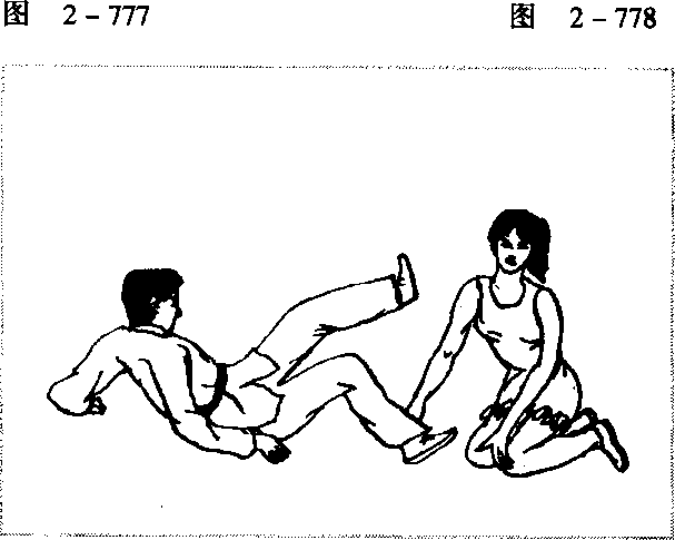 不慎倒地,可将双腿伸到对方裆内(图2-775),然后身体 左后倒,双脚用乌龙绞柱的方法猛绞其腿,可令对方例后倒地 (图 2 -776)。