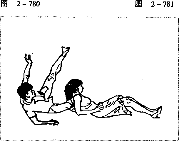 被歹徒拖翻在地(图2-780),可用手反向圈抱其离我最近 的一条腿(图2-781),肘关节收紧,身体向侧后翻滚一周,可 令歹徒倒地(图2-782)o