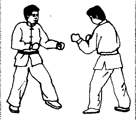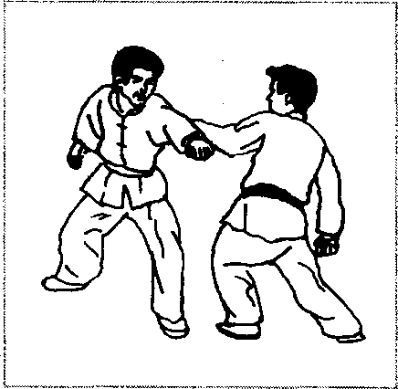 若对方先行发拳打我,我则可用切臂正勾裆的方法进行反 击,具体方法如下。
