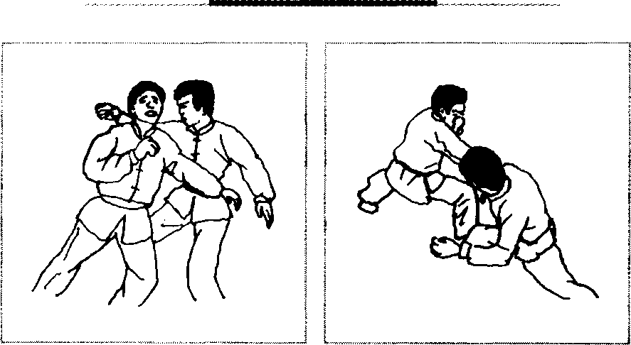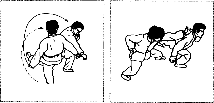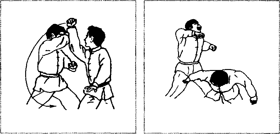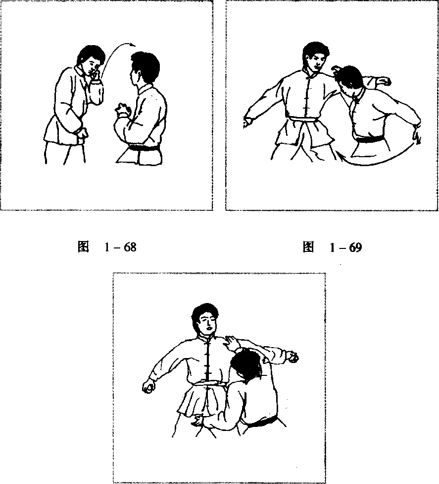 敌我对峙(图1 -68),敌突发左摆拳击头,我身体前靠, 用右前臂前切对方肘关节内侧(图1 -69),左手借前靠之势, 抓勾敌人的裆部要害(图1 -70)o