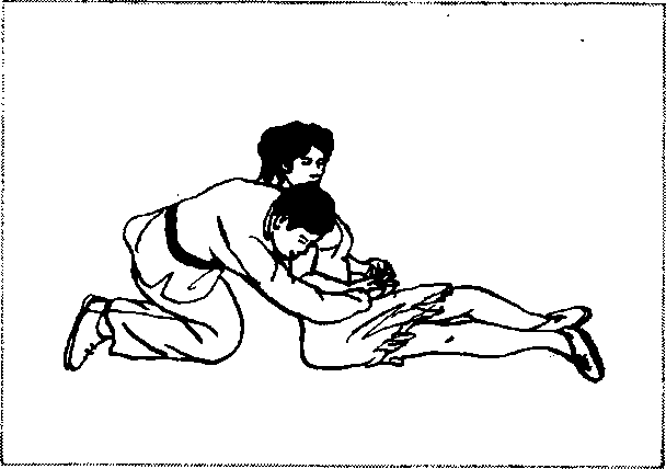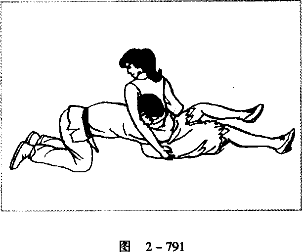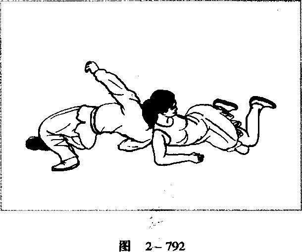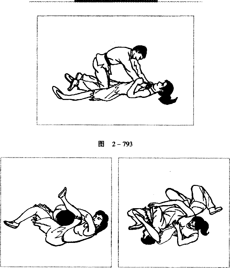 被歹徒压倒在地上(图2-793),可迅速收腹,用左腿膝弯 反夹其头颈部(图2-794)。然后左脚猛向下蹬,同时身体向左 翻滚,可令歹徒憋气倒地(图2-795)。