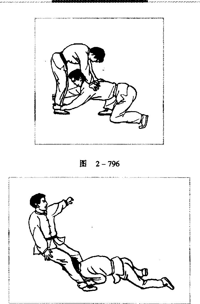 被对方按倒,可在倒地瞬间双手扣抱对方双脚脖(图 2-796)o然后双脚猛蹬地面,身体前钻,以肩部猛撞对方膝关 节,令对方后倒(图2-797)o