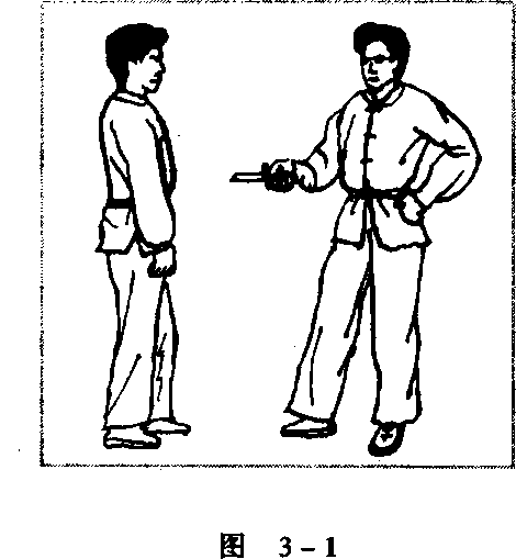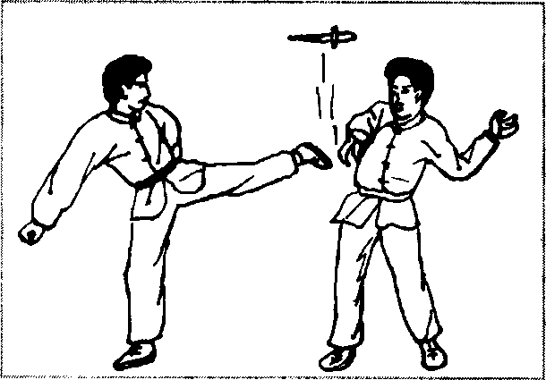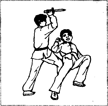 匕首或菜刀都具有刀刃锋利、威胁性大的特点。较好的方法 是在歹徒刚掏出凶器的那一瞬间(此时歹徒抓握凶器的姿势对我 威胁性较小),或在其骄横得意、掉以轻心的时候,突然起脚踢 落其凶器,然后猛扑上前,击打他的要害部位,使其瞬间丧失战 斗力。例如当歹徒手持匕首,上下抛动威胁我时,我突然起左 腿,踢飞其匕首,然后猛扑上前,用右手戳击其双目,使其致残 (图 3-1.图 3-2、图 3-3)o