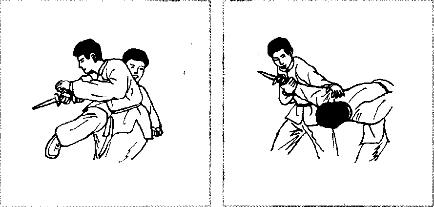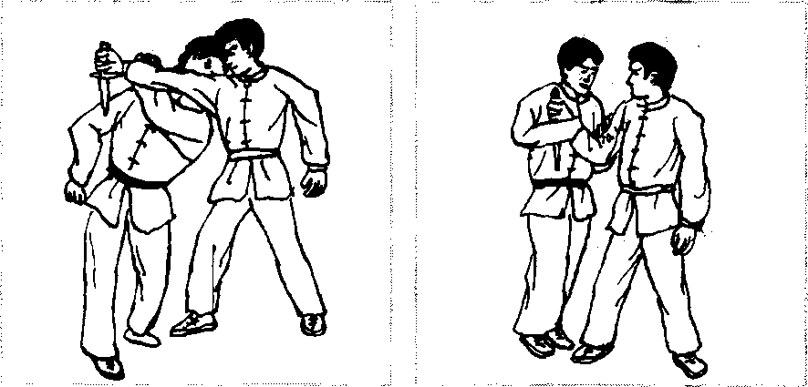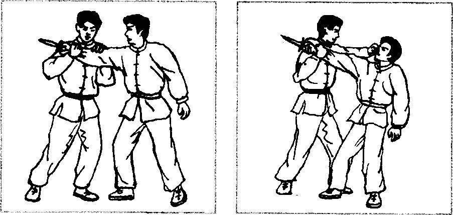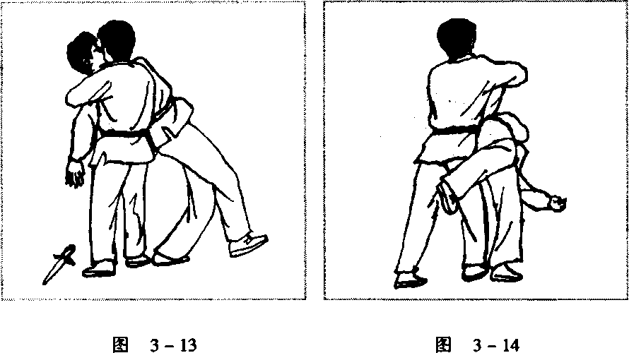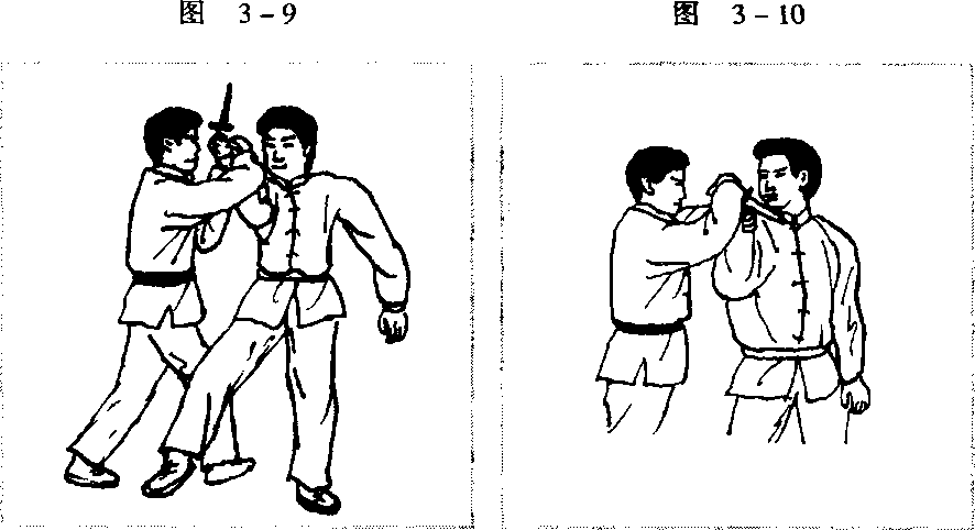 3- 10)。左手猛拍其持刃腕背,然后双手将其腕向他胸前推去, 右脚同时顺势进步于他右腿后侧(图3-11、图3-W.o