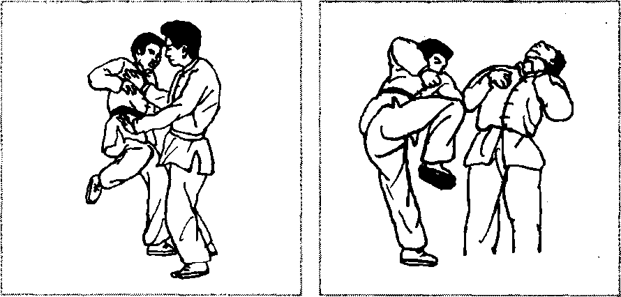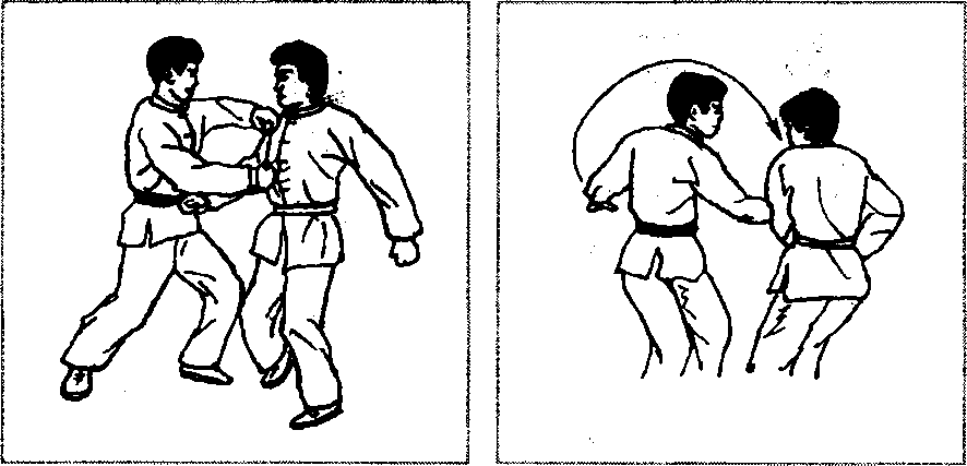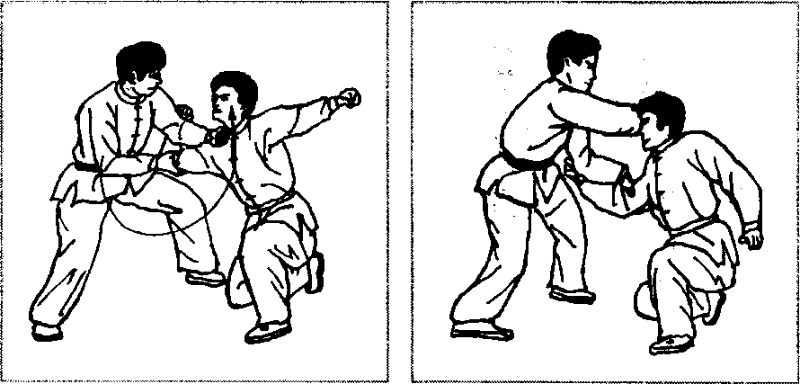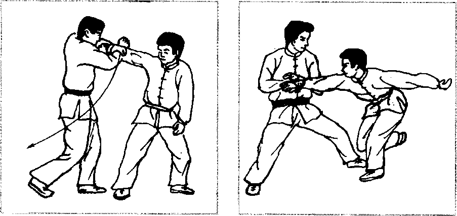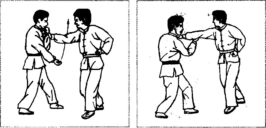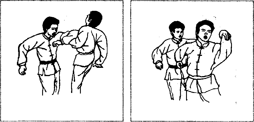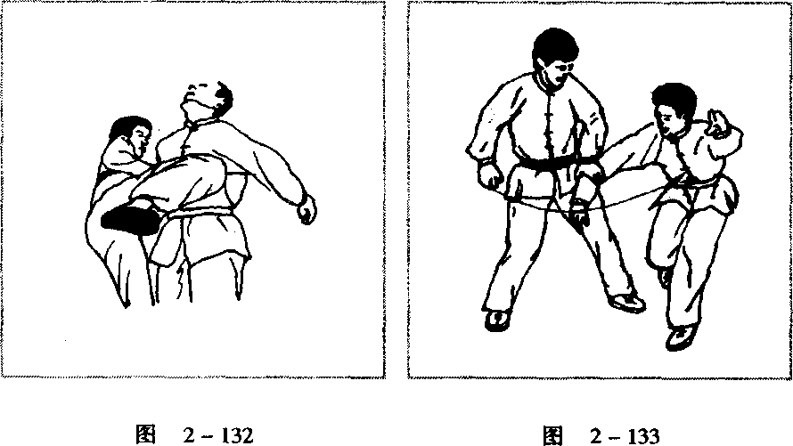 缠住对方手腕以后(图2-128),先顺牵,使其身体前倾 (图2 - 129),然后提膝猛然撞肋或撞心窝(图2 - 130.图 2-131、图2 - 132),重创对方。也可以顺牵后(图2-133),以