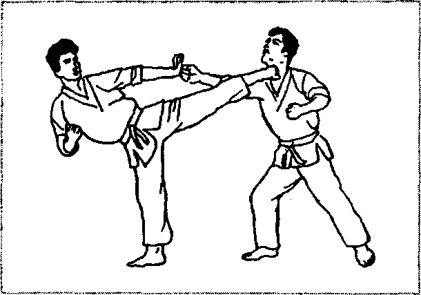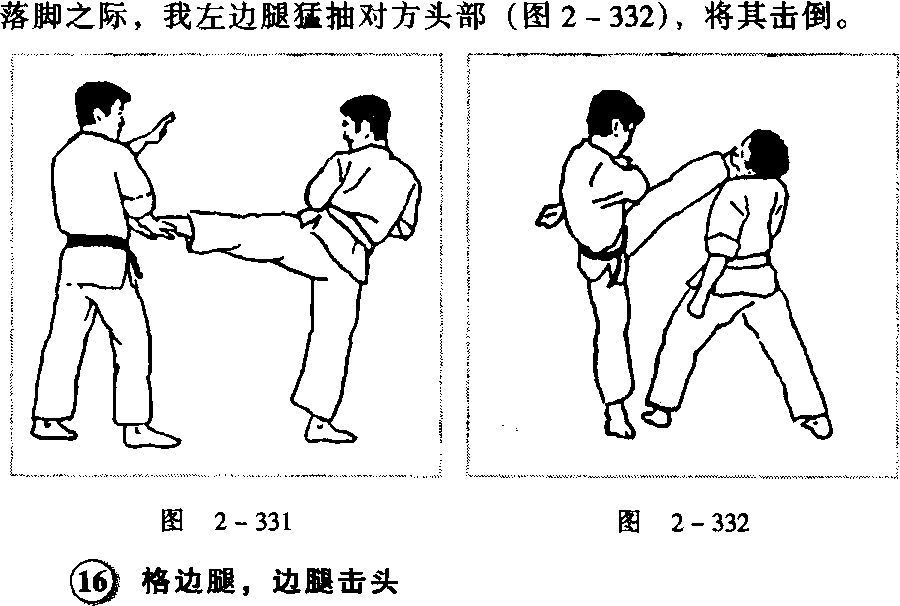 对方右冲拳击头,我可身体略后闪,同时发左侧踹腿击其胸 (图2-329)。左脚在侧踹击胸后往对方侧后方落地,腰往左扭 转,发右边腿击面(图2 - 330),很容易将对方击倒或击昏。
