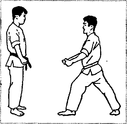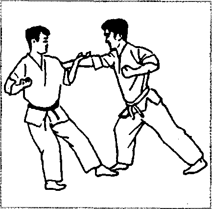 与敌对峙(图2-333),他用右边腿击头,我可用左前臂外