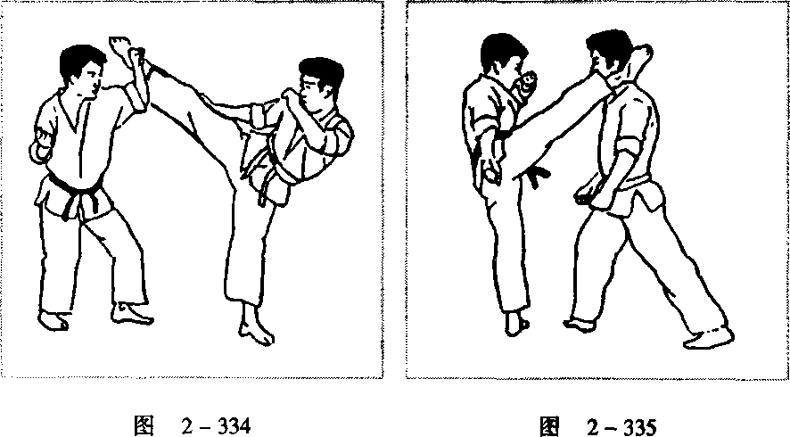 格来腿(图2 - 334),身体向左拧腰顶胯,趁对方收腿之机以右 边腿攻击对方左侧面部(图2 - 335)。