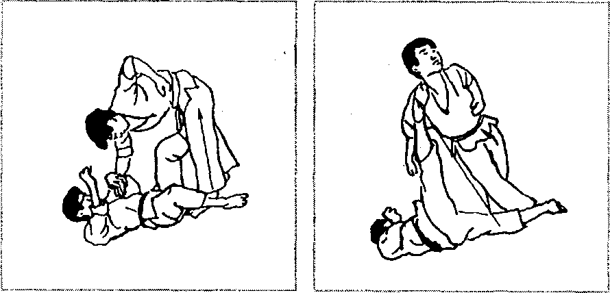 如果我不慎倒地,对方俯腰欲用拳击头之际,我可一边用手拨 格来拳,一边用左脚蹬踹其裆部要害(图2-338)。然后身体迅速左 翻,发右边腿猛击对方面部(图2-339),将其踢倒在地。