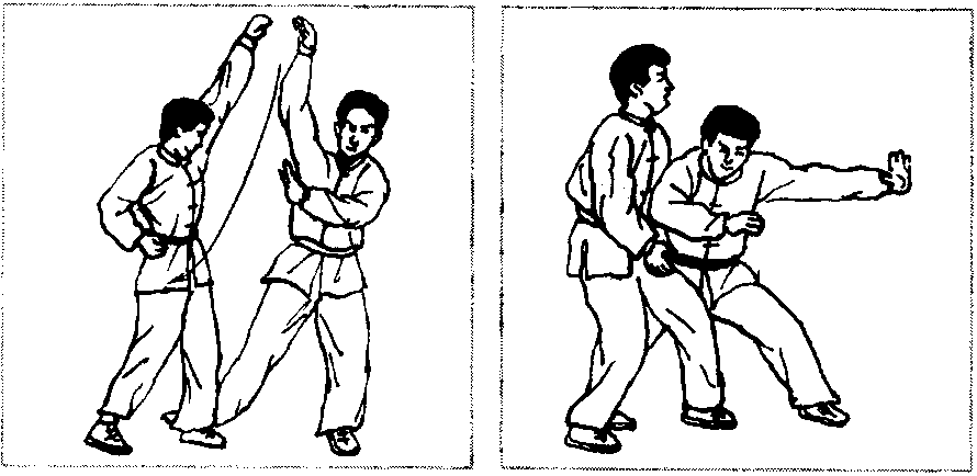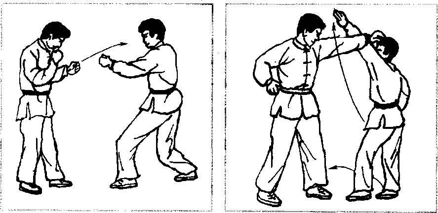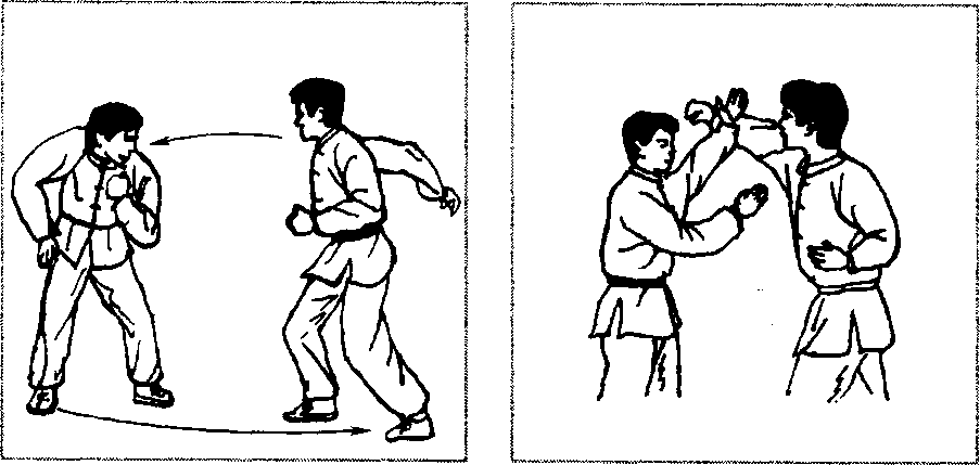 对方欲以右摆拳击头(图2-431),当对方来拳将至之际, 我左臂外格、前切其肘(图2-432),右脚同时向前上一大步, 左手牵腕后拉,令其重心前倒,仆身在我肩上,我的右手由其裆