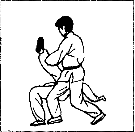 对方在实战中用右侧踹腿击腹,我可用右手下拍来腿(图 2-428),同时跳转身,左拳狠劈敌面,然后左脚锁住对方后腿, 身体左后转,左抡拳猛拦对方头颈部,令其倒地(图2 -429、 图 2-430)。
