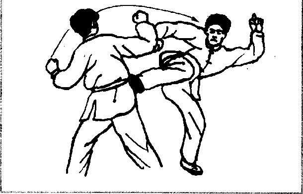 敌我如图2-423所示对峙,对方左直拳击来,我左臂外格 (2 - 424),右脚扣上一大步手对方前脚后方,右手同时由其腋窝 下穿出(图2-425),身体猛地下坐并向右后拧转,以倒肘猛砸 对方的胸腹部(图2-426)o以右膝前顶对方后膝弯,身体随倒 击肘继续右后转,可轻松令对方后倒(图2-427)o