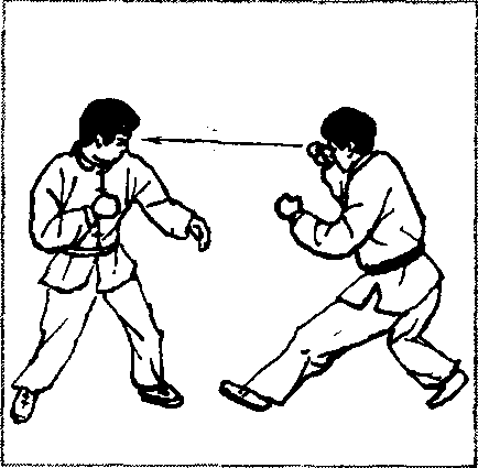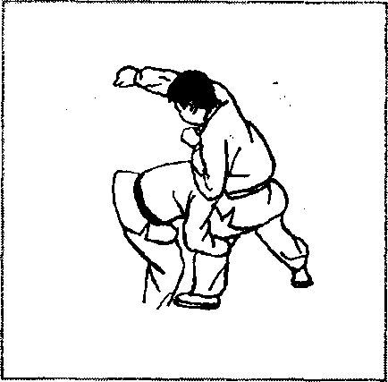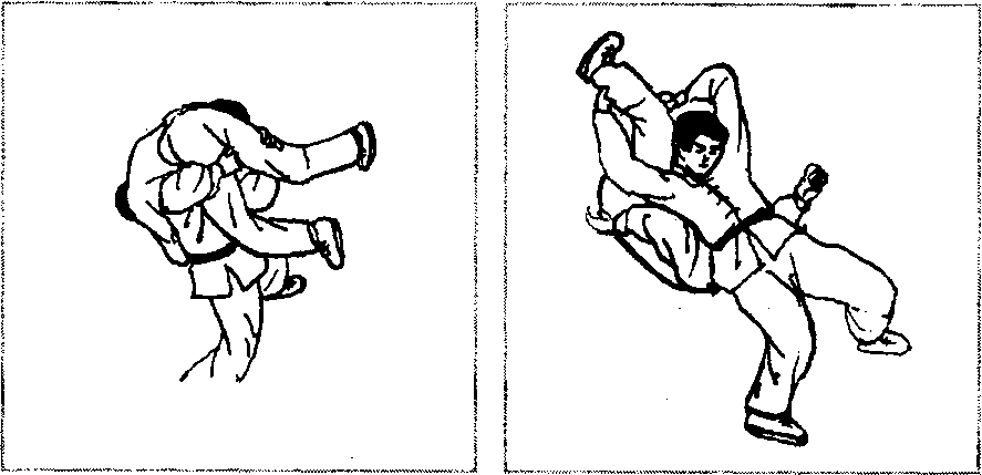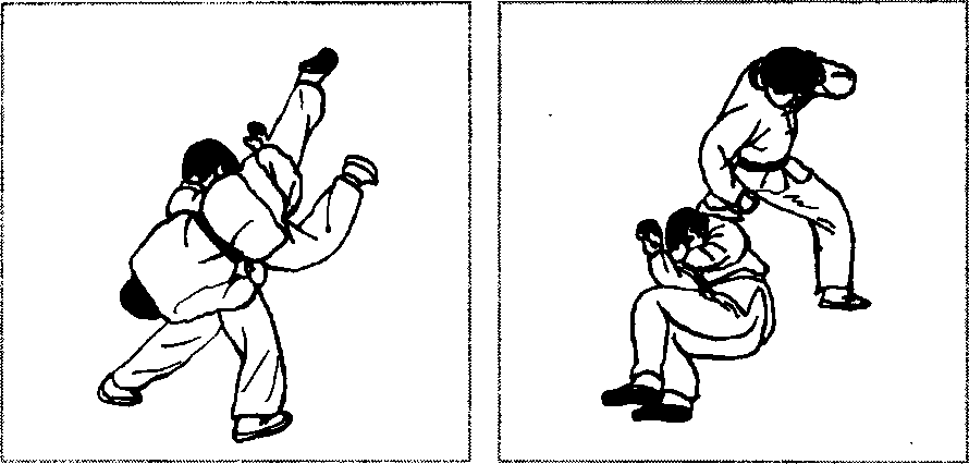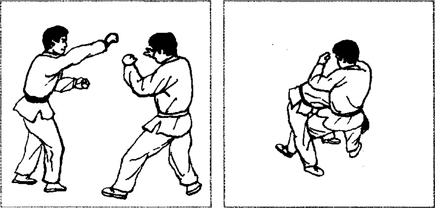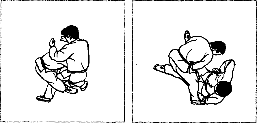 敌我如图2 - 485所示对峙,对方右冲拳击头,当其拳锋将 至之机,我突然蹲身前抱其离我最近的一条腿(图2 - 486),借 其冲拳之势,我顶腹送髓,将其向上抱起(图2-487)。然后继续