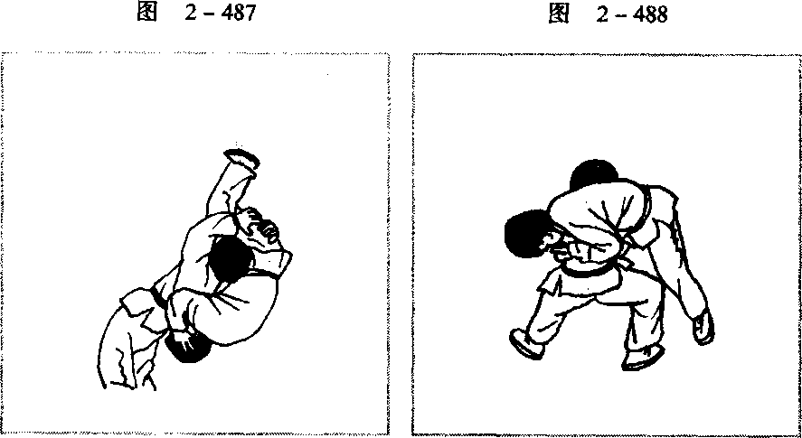 顶腹送髓,仰身主动后倒,使对方由我胸部上方,领先倒栽着地 (图2-488)o图2-489是过胸以后的反视图。若对方被抱起时 重心很靠前(图2 - 490),我则不用继续顶腹后倒,仅需双腿蹬 直,起立,双手抱腿上抛(图2-491),即可将对方从我肩部上 方摔过去(图2-492)。