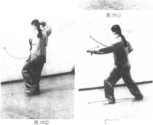 图29③图29③重心右移,左脚回收 即又上步,同时右拳变掌,臂 由体右屈肘收手于右腰间,掌 心朝上;左手由胸前下落向左 划弧;目随右手。(图29①、②、 ③)图29③图29③图29④图29④图30?图30?图29④图29④图30?图30?(2)右脚向前上步;右 手由左臂内向前托出,臂微 屈,掌心朝上,高与头平;左 手按于右肘下,掌心朝下,目 视右前。(图29④)