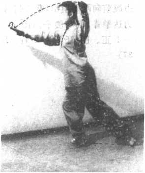 掌同时变拳由体左经上向右劈 拳于右掌心,臂微屈,力达拳 轮,目视手方。(图36③、④)