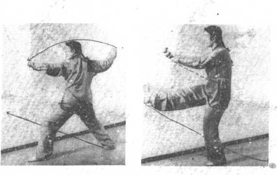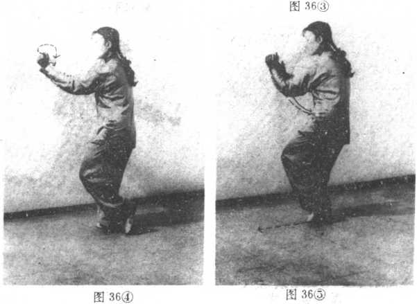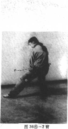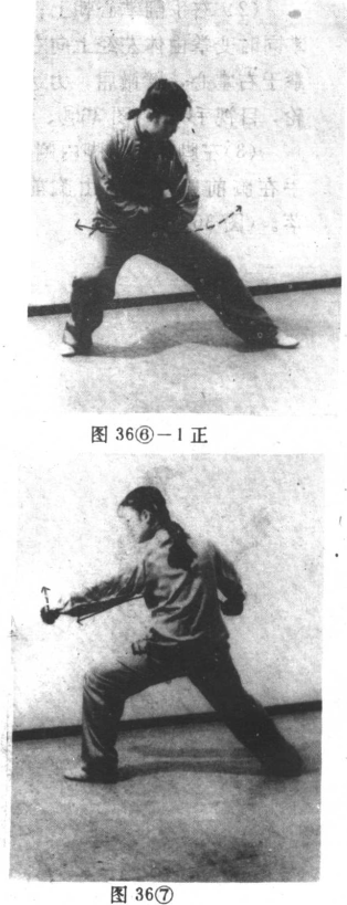 (4) 左脚向前上步,双手 由腹前向两侧崩出,拳心朝内, 力达拳背,高与腰平。(图36⑥ 一 1正、图36@-2背、图 37)